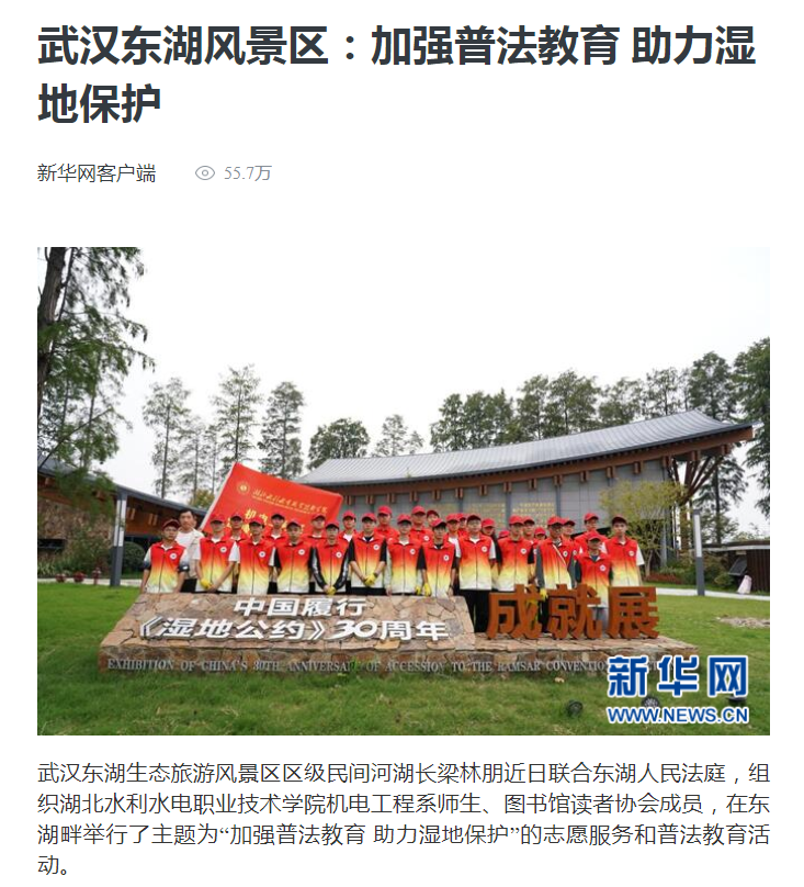 近日,新华网报道Beat365官网教师、武汉东湖生态旅游风景区区级民间河湖长梁林朋,联合东湖人民法庭,组织Beat365官网师生举行主题为“加强普法教育 助力湿地保护”的志愿服务和普法教育活动。