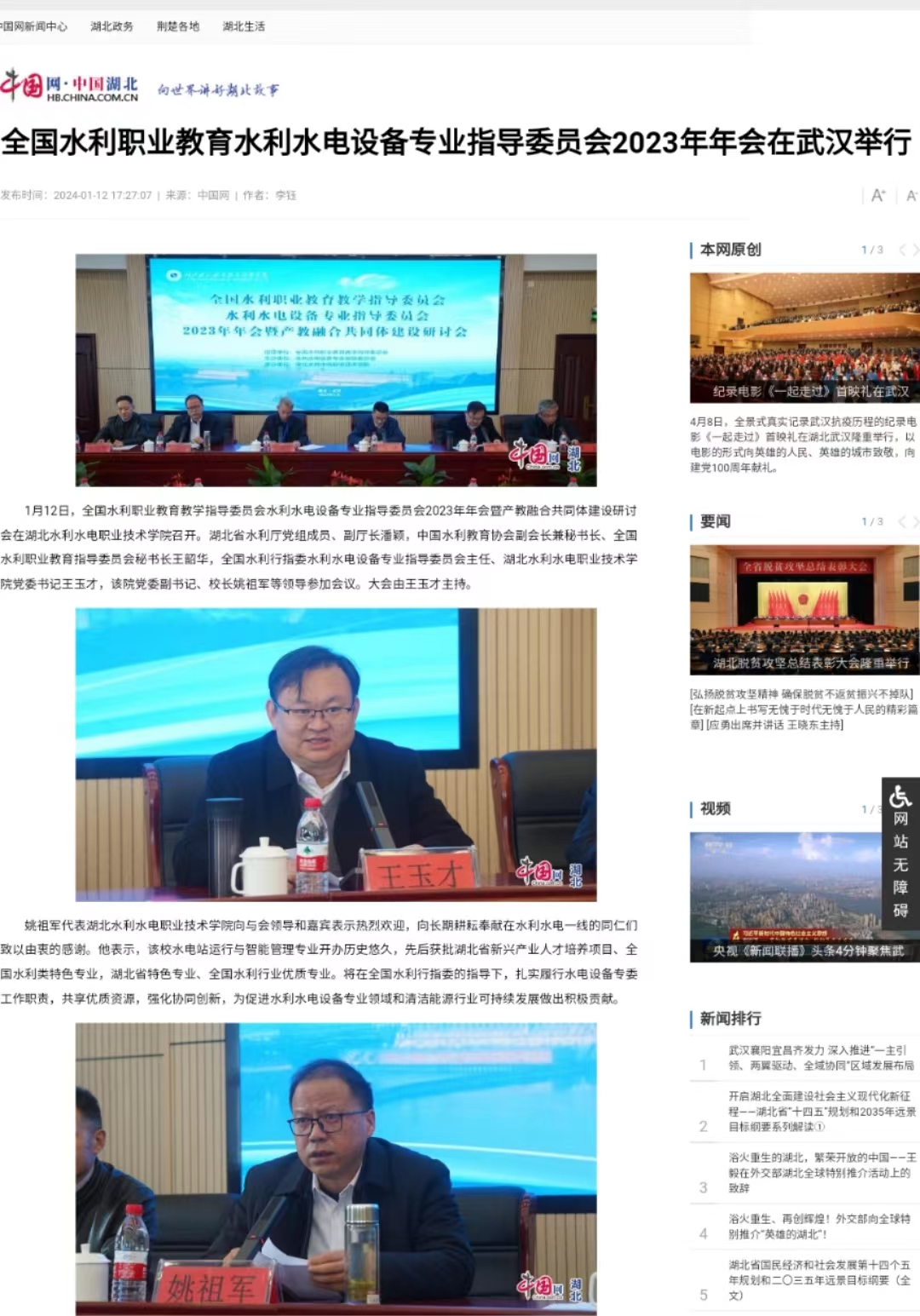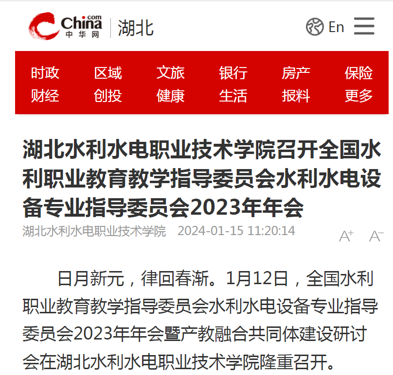 1月12日,中华网以《全国水利职业教育水利水电设备专业指导委员会2023年年会在武汉举行》为题,对Beat365官网成功举办全国水利行指委水电设备专委会2023年年会暨产教融合共同体建设研讨会进行报道。