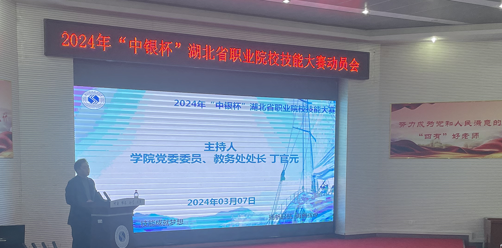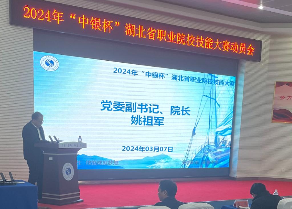 3月7日下午,学院在南校长江楼报告厅召开2024年“中银杯”湖北省职业院校技能大赛赛前动员会。党委副书记、院长姚祖军出席会议并讲话。党委委员、人事处处长桂剑萍,党委委员、党委办公室主任张博,教务处相关负责人、五系两部负责人、参赛指导教师及参赛选手等百余人参加会议。会议由党委委员、教务处处长丁官元主持。