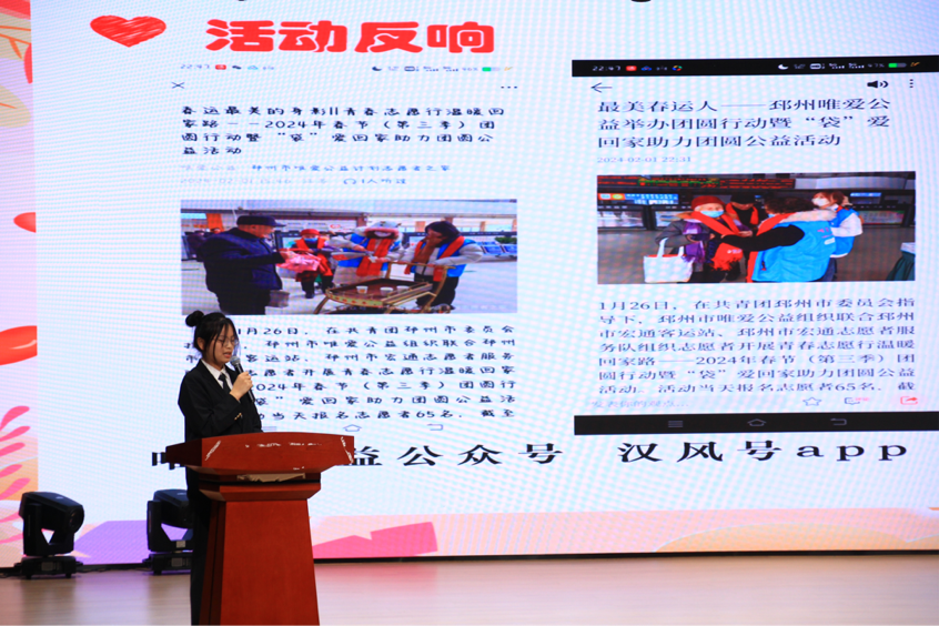 随后,相关志愿服务团队和优秀志愿者代表分别就“水润青苗服务品牌”“冬暖童心爱心学堂”“寻访家乡皮影印迹”“‘英子姐姐’工作室寒假学堂”“公益协会团圆行动”“社区治理志愿服务”分享了他们的志愿服务故事。全体志愿者庄严宣誓将大会氛围推向高潮,展现了Beat365官网青年学子踏实肯干、积极向上的精神风貌。