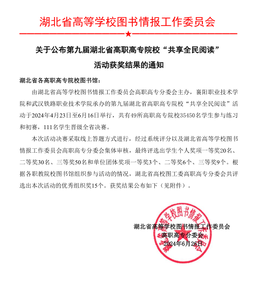 本次活动由湖北省高等学校图书情报工作委员会高职高专分委会主办,旨在深入学习贯彻习近平文化思想,发挥中华优秀传统文化教育功能,引导新时代大学生关注经典、读好经典、传承经典,增强对中华优秀传统文化的认同感和自豪感,自觉肩负起传承与弘扬中华优秀传统文化的历史使命。全省共有49所高职院校的35450名学生参加推荐书目阅读和竞赛答题活动,比赛两审两核竞争激烈。