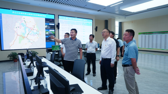 随后,姚祖军一行来到丹江口水库水质安全保障指挥中心,观看《数字赋能筑牢守水防线》宣传片,了解了水质安全保障监管平台、水质安全保障调度平台、水质安全保障监督平台等三大平台,以及断面水质监测、卫星/无人机遥感水质监测等数智化系统。
