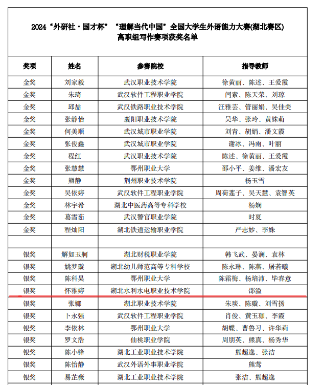 11月1日,学院建筑工程系23级室内设计专业学生怀雅婷在“外研社国才杯”全国大学生外语能力大赛写作赛项湖北省赛中荣获银奖。据悉,这是学院在去年获得铜奖的基础上,在该项赛事上的又一次突破。