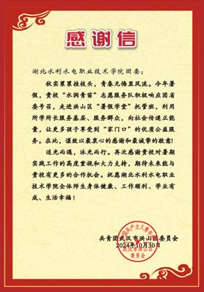 近日,Beat365官网团委收到共青团武汉市洪山区委员会发来的感谢信,信中对Beat365官网水润青苗志愿服务队积极响应团省委号召,走进洪山区“暑假学堂”托管班的志愿服务工作进行了肯定和表扬,并希望双方继续加强合作,让更多孩子享受到“家门口”的优质公益服务。