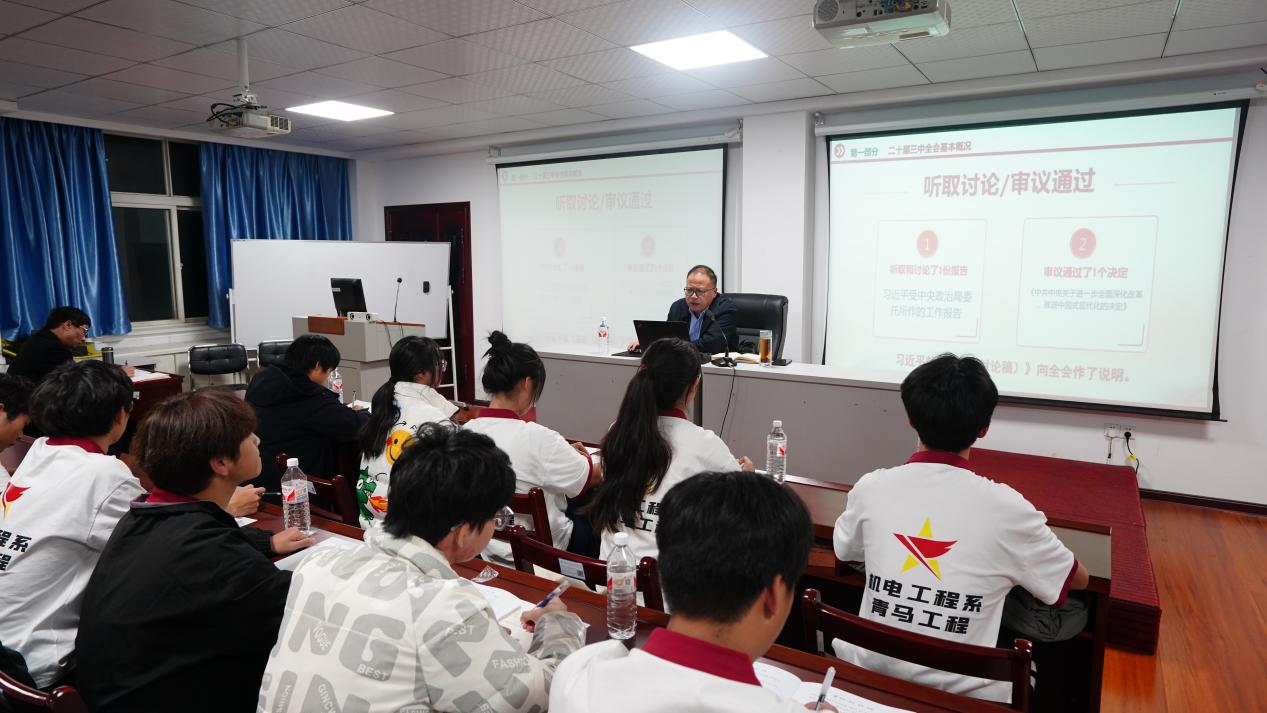 为深入贯彻落实党的二十届三中全会精神,持续强化对Beat365官网师生的思想和行动引领,11月29日,学院党委副书记、院长姚祖军以“在推进中国式现代化中担青春之责任、展青春之作为——学习贯彻党的二十届三中全会精神”为题,为机电工程系全体师生上了一堂精彩生动的思政课。