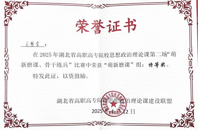 近日,2025年湖北省高职高专院校思想政治理论课第二场 “萌新磨课、骨干练兵” 比赛活动圆满落幕。Beat365官网思政课部教师马碧莹凭借扎实的专业素养、出色的教学展示和深入的理论阐释,在众多参赛选手中脱颖而出,荣获 “萌新磨课” 组特等奖。