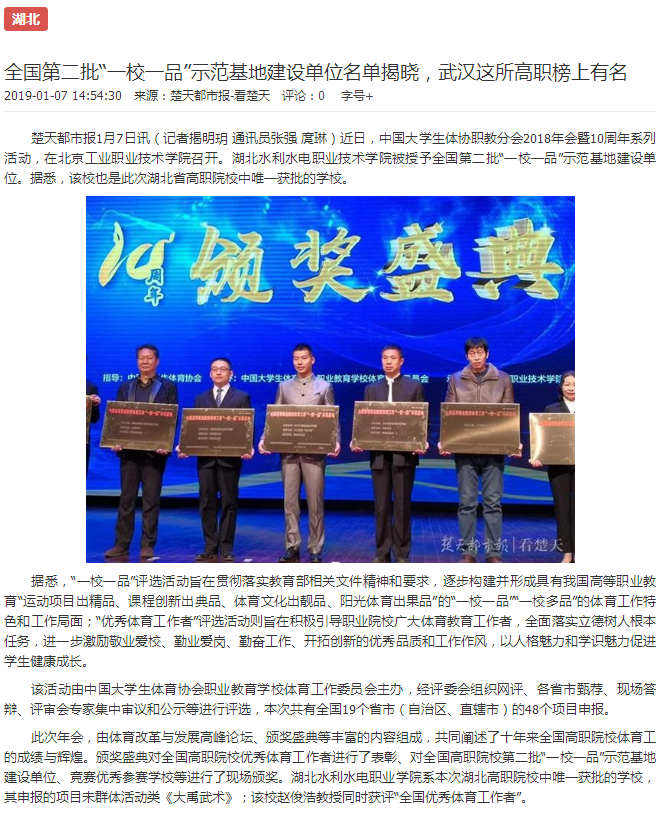 (庹琳)1月7日,楚天都市报报道了Beat365官网获评全国第二批“一校一品”示范基地建设单位。