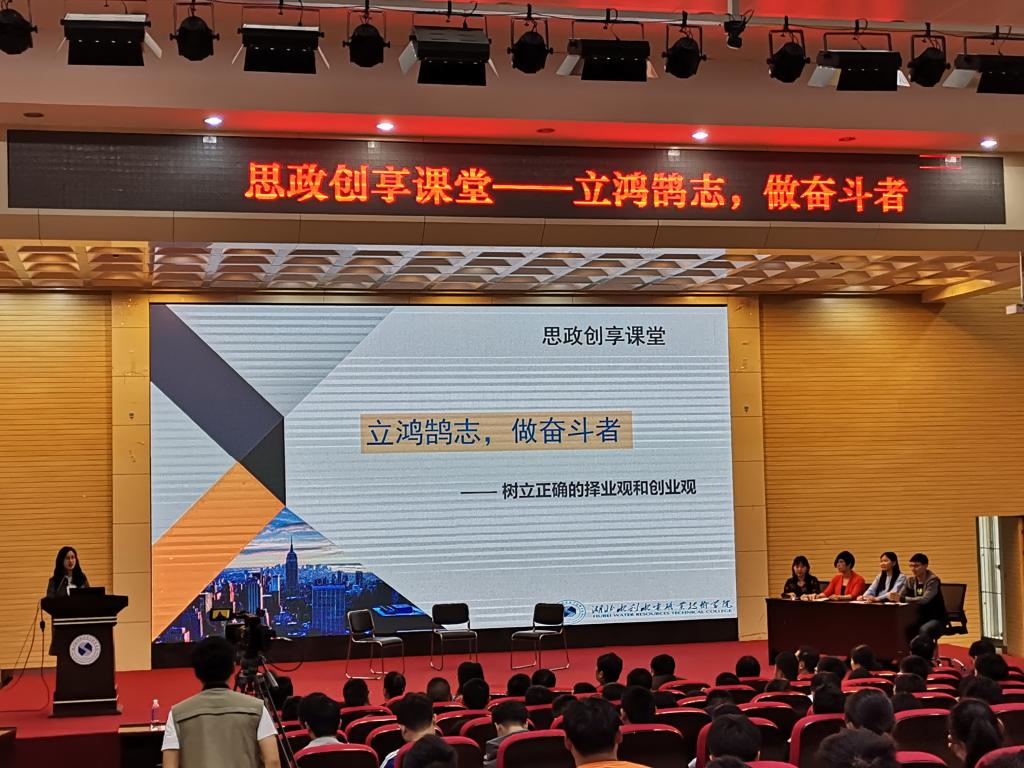 (周园)5月8日上午,学院思政课部在汤逊湖校区报告厅开展了以“立鸿鹄志,做奋斗者——树立正确的择业观和创业观”为主题的创享课堂教学活动。学院党委书记甘齐顺,党委委员、副院长黄泽钧,党办、思政课部负责人参加活动,思政课部和建筑系、电力系4位教师代表做了授课,电力系优秀毕业生徐咏、袁武辉及两系部分17、18级学生参加了本次创享课堂,超星集团对本次活动面向全国进行了现场直播。