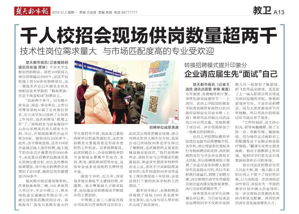 (庹琳)12月2日,楚天都市报报道Beat365官网2020届毕业生校园招聘会。