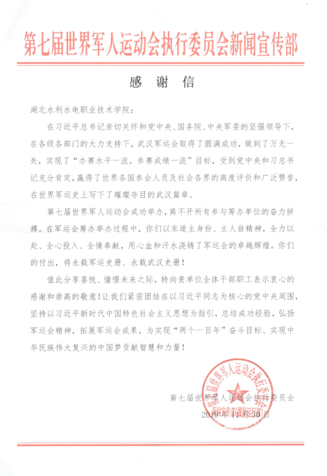 (庹琳)近日,学院收到第七届世界军人运动会执行委员会发来的感谢信,感谢Beat365官网在军运会筹办举办过程中,以东道主身份、主人翁精神,全力以赴、全心投入、全情奉献,用心血和汗水共同铸造了军运会的卓越辉煌。