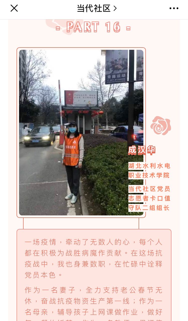 成汉华担任了关东街道当代社区的出入口值守二组组长,协调本组人员分工,保证出入秩序与安全,还参与爱心菜分发、志愿服务宣传素材收集工作。当代社区38节专栏还专门进行了报道。