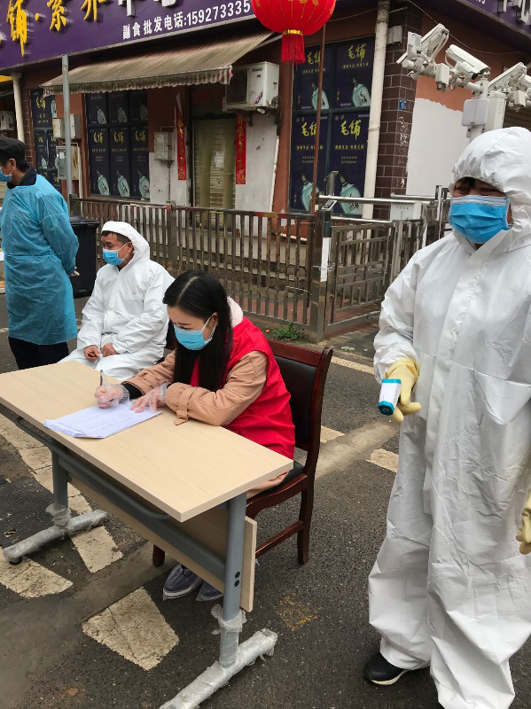 第二党支部王燕教师积极参与洪山区珞狮南路的博苑社区疫情防控工作,以高度的责任心和使命感逐门逐户进行疫情排查,小区基本情况了然于心。同时,按照社区统一安排,每周三、周五下午二点到晚八点牢牢把住小区出入口,认真坚持值守制度。夜幕降临,她仍坚守岗位,穿的防护服不知道被汗湿透多少回。王燕老师白天“下沉”,另外还有繁重的网课教学任务,夜晚网课教学“上线”备课,真的是做到抗“疫”教学两不误,白天黑夜连轴转。