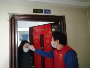(先锋队员测量社区居民体温、询问生活困难及需求)