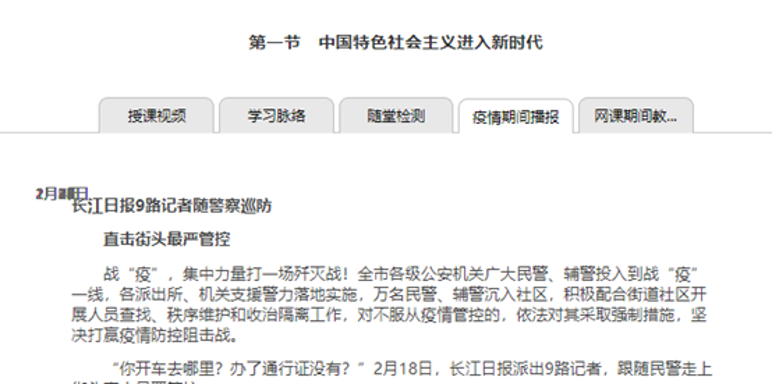 本课程按照教育部及学校关于思政课线上教学的建议与部署,鉴于网络稳定性的问题,舍弃了直播了方式,而是采用了资源+平台的线上教学模式。