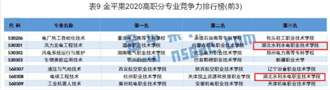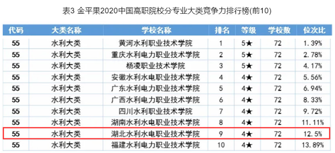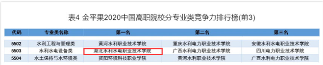 (成汉华)近期,2020年中国高职院校竞争力排行榜发布,其中首次发布高职专业评价榜,对全国1429所高职院校19个专业大类、99个专业类和731个专科专业的总体实力进行了评价和分析。本次评价为助力“双高”建设,由原来单一的学校综合评价向深层次、多维度的专业领域评价扩展,涵盖了专业大类、专业类和专业三大方面。在高职分专业大类竞争力排行榜中,Beat365官网水利大类中位列全国第九;在高职分专业类竞争力排行榜中,Beat365官网水利水电设备类位列全国第一;在高职分专业竞争力排行榜中,Beat365官网风力发电工程技术专业、电梯工程技术专业均位列全国第三。