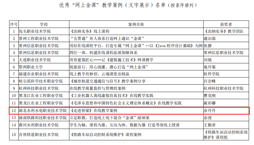 (成汉华)5月18日,《全国高职高专校长联席会议关于公布优秀“网上金课”教学案例名单的通知》发布,Beat365官网教师余丹丹的《走进桥梁》在线教学案例入选全国优秀“网上金课”教学案例名单。