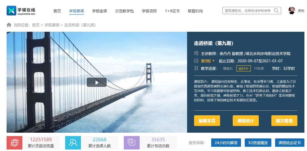 《走进桥梁》在线开放课程利用北京学银在线教学平台对全网开放,自2015年建课自今,已运营至第九期,累计页面浏览量达12251588,选课人数高达22668人,课程用“互联网+”等现代信息技术手段,率先推进课程改革、教学方式与学习方式变革,极大地提高教学质量,在省内外具有良好的示范效应和影响力。此次又一重大国家级荣誉的认定,是Beat365官网近年来全面推进信息化课程与智慧化课堂的成果积累,将进一步推动学院在新时期高质量发展主题下三教改革的步伐。