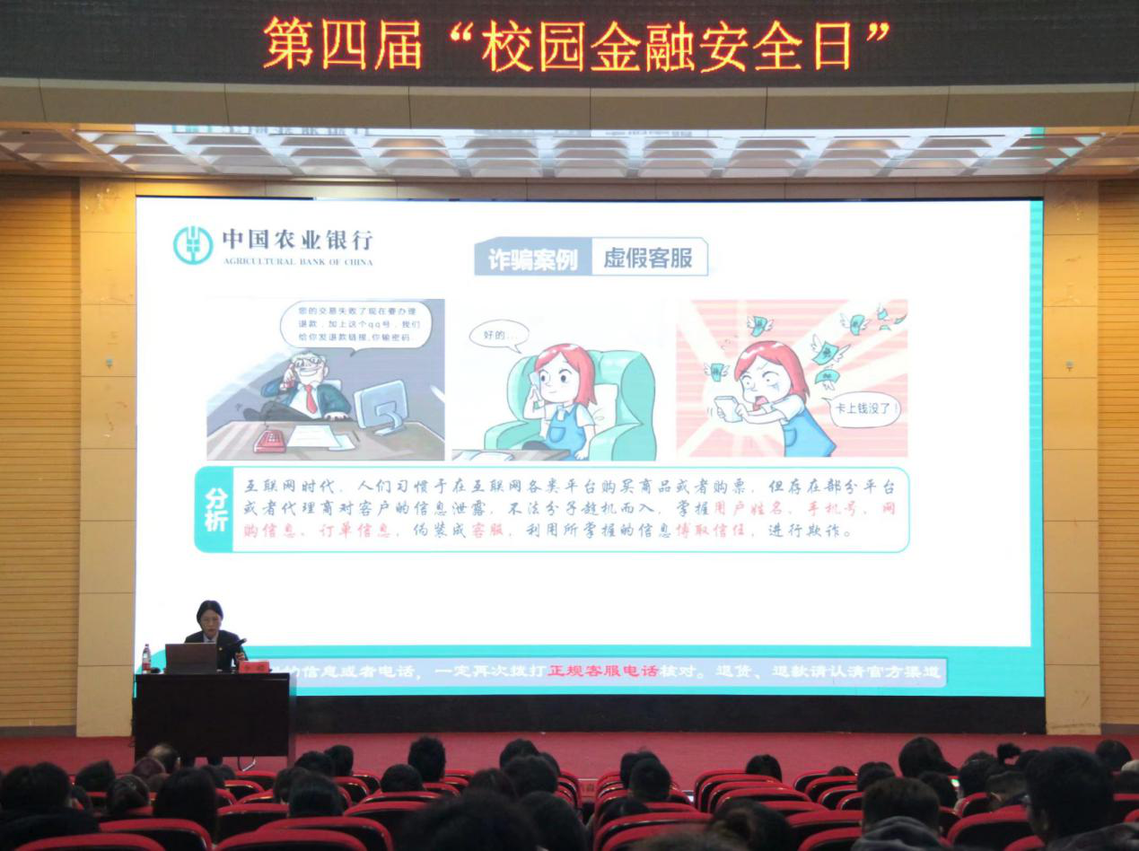 (张艺蕾)12月8日和12月10日下午,学院分别在汤逊湖校区和南湖校区举办了第四届“校园金融安全日”活动。本次活动由财务处和学工处联合举办,中国农业银行理财经理李璐作了专题讲座。财务处、学工处、院团委负责人,全体新生辅导员及600余名两校区学生代表参加了活动。