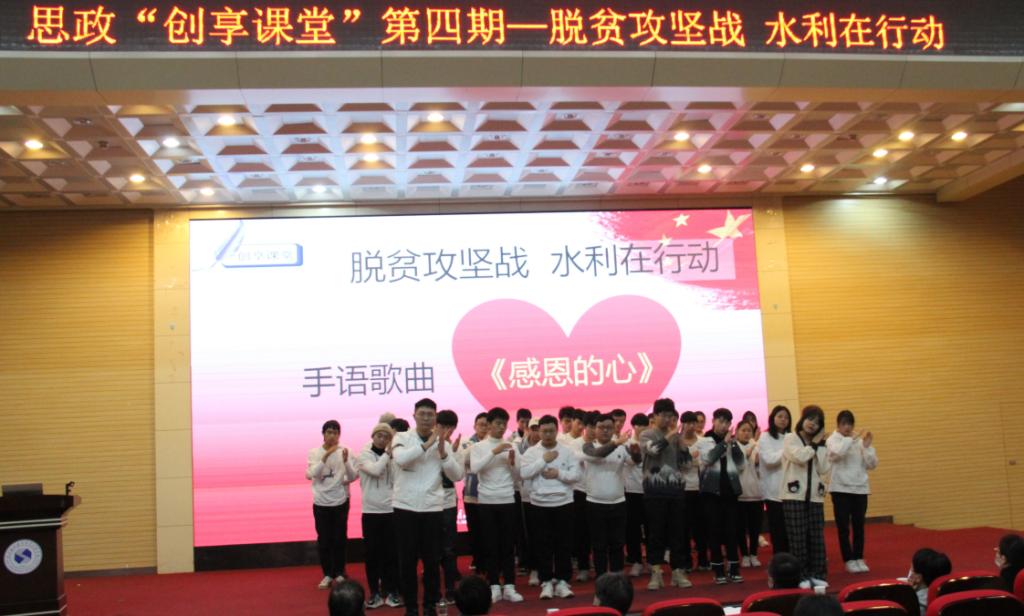 课上,三名思政课老师从新中国成立到二十一世纪中叶中国共产党的奋斗目标、脱贫攻坚在实现全面小康中的作用、水利行业参与扶贫的举措,引出水利行业扶贫的关键举措在于发挥行业优势,利用水利基础设施建设,重点解决贫困人口的饮水安全问题。随后,两位水利专业教师以南水北调工程为例,为同学们讲授水利人如何在保证足够水量和水质的同时助力脱贫攻坚战。期间,学院为推进扶贫攻坚而开办的水利郧阳订单班的全体同学们,表演了手语歌《感恩的心》。