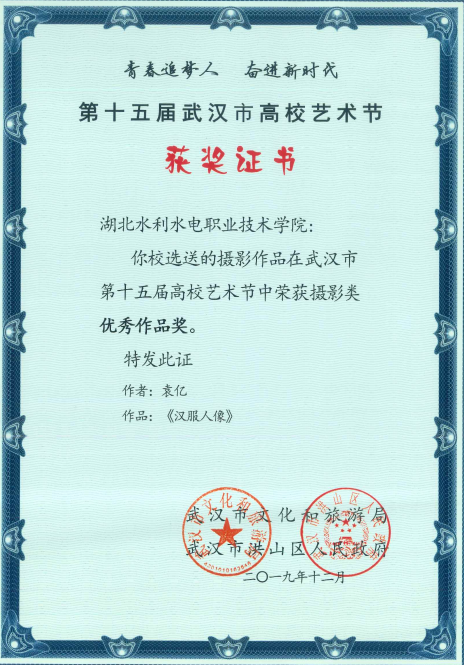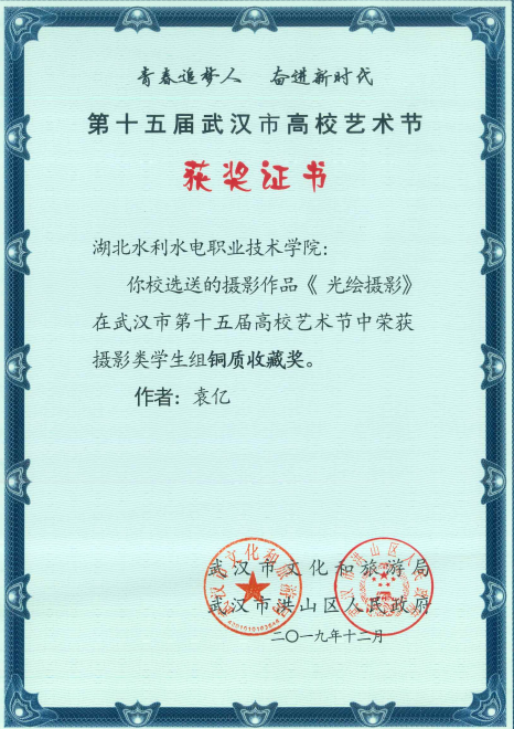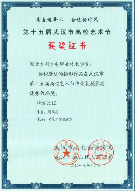 Beat365官网师生积极参与本次艺术节的摄影作品征集活动,水利工程系18级测量1班学生周围亮摄影作品《花开梦随航》荣获优秀作品奖,水利工程系18级水利8班学生袁亿两幅摄影作品《光绘摄影》、《汉服人像》分别荣获铜制收藏奖和优秀作品奖。此外,这两位学生以及Beat365官网建筑工程系邱兰老师的作品被第十五届武汉市高校艺术节摄影比赛优秀作品集收录出版。
