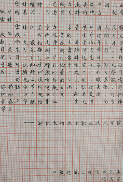 (舒卓)为喜迎建党一百周年,深入践行社会主义核心价值观,进一步弘扬雷锋精神和志愿精神,推动学雷锋活动常态化、机制化,形成践行雷锋精神、争当先进模范的生动局面,学院建筑工程系在3月举办了“雷锋精神大家谈”系列文创作品征集活动。