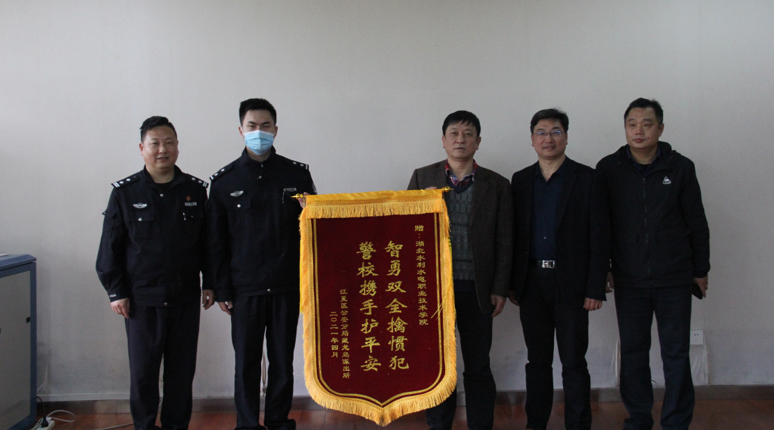 (王海韵)4月19日下午,藏龙岛派出所刘所长与片警梁警官亲自到学院汤逊湖校区,为学院送来锦旗“智勇双全擒惯犯 警校携手护平安”,充分肯定Beat365官网电力电子工程系学生4月4日见义勇为抓小偷的英雄事迹。学院党委书记甘齐顺,党委委员、招毕办主任冷涛,保卫处负责人等到场接受锦旗。