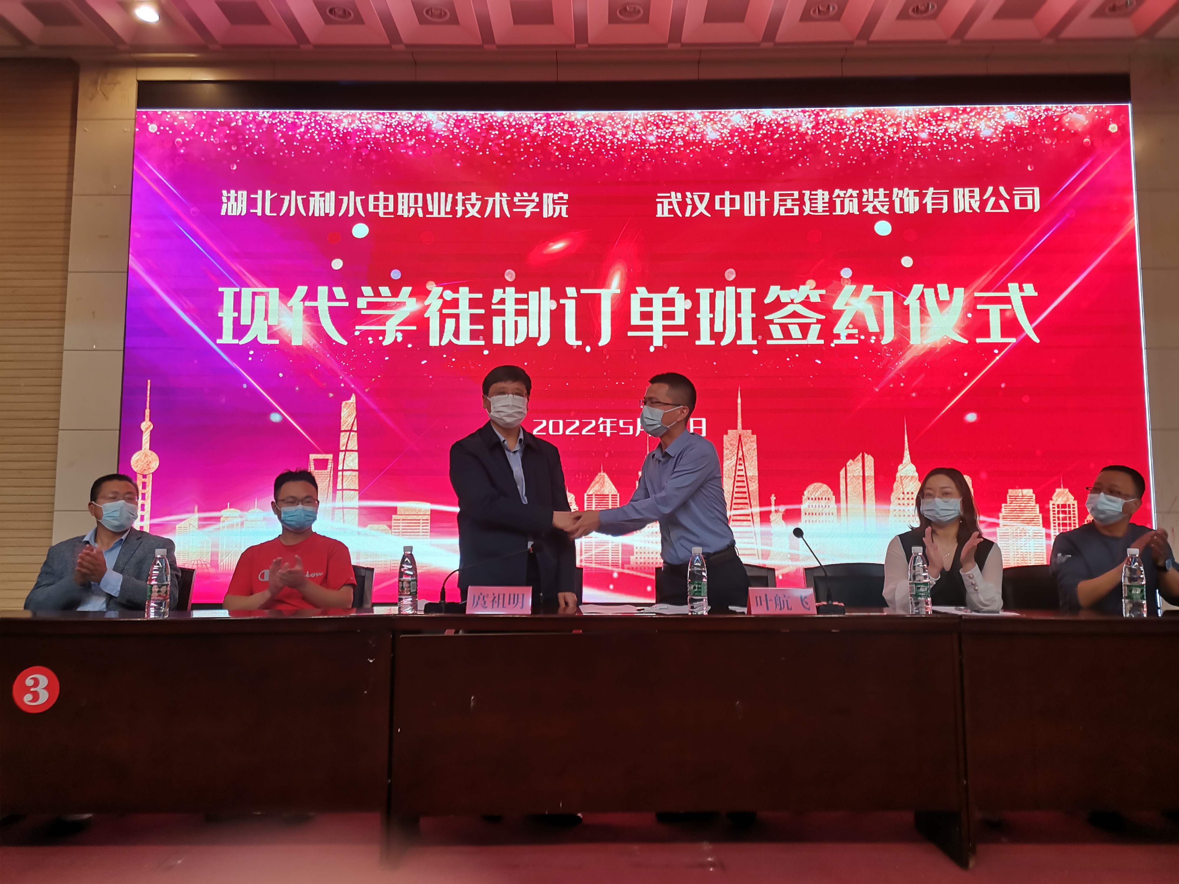 (建筑工程系)5月12日,建筑工程系在汤逊湖校区学术报告厅举行了现代学徒制“中叶居人才订单班”签约仪式,院党委委员、副院长庹祖明,建筑工程系负责人、专业教师,以及武汉中叶居建筑装饰有限公司总经理叶航飞,副总经理刘宏枫等共同出席了活动。