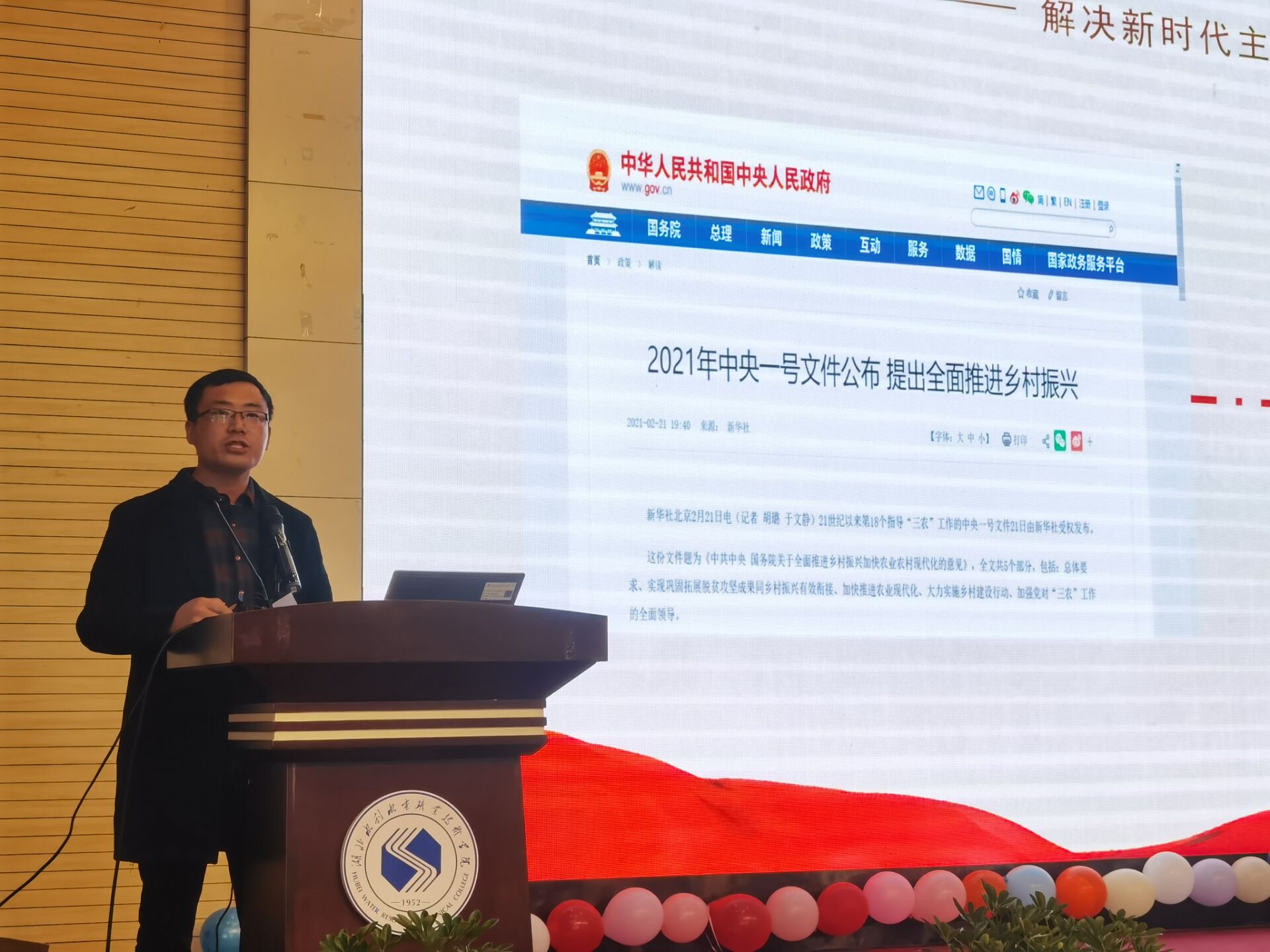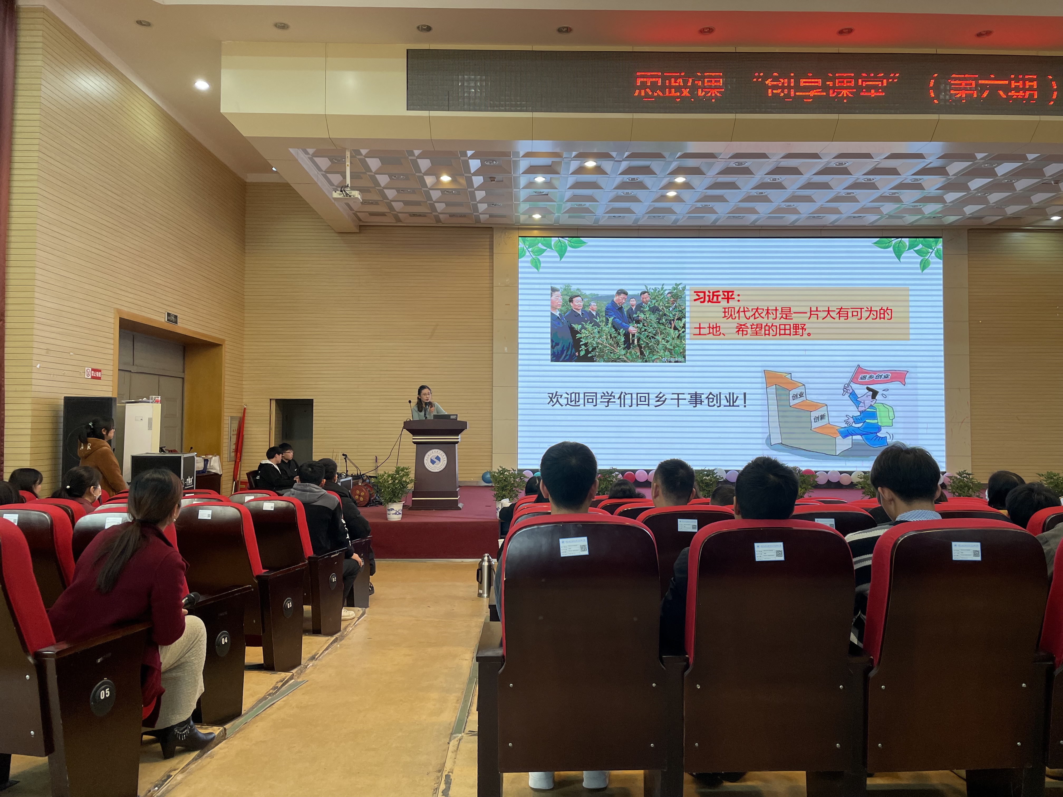 (张靓)12月10日下午,酝酿多时的第六期思政课“创享课堂”,在学院汤逊湖校区报告厅成功开讲。本次课程的主题是“乡村振兴谋发展,智启未来守初心”。来自湖北艺术职业学院人文与社科学院乔亚兰院长及3位教师、湖北大禹集团的多位领导等嘉宾,与学院领导、相关部门负责人、专业教师、辅导员和各系学生代表共同观摩了本次课堂教学。