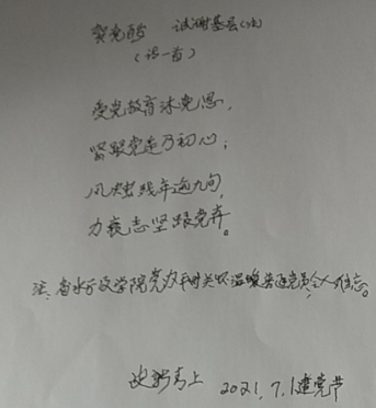 (庹琳)在中国共产党成立100周年即将到来之际,学院开展“七一”走访慰问老党员、困难党员活动,让党员们深切感受到了党组织的关怀和温暖。学院受到慰问的九旬老党员史新青老师为表达对省水利厅党组及学院党委的感谢,特赋诗一首,原文如下。