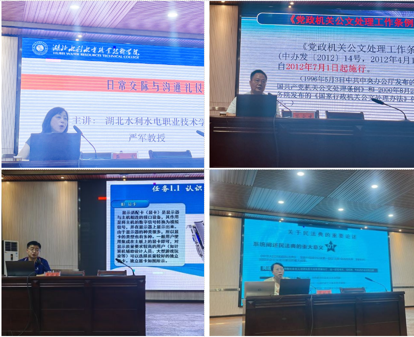 培训会上,学院商贸系副主任严军教授讲解日常交际礼仪,分别对生活上和工作中不同场合的交际礼仪做了详细讲解。基础课部主任管宏才传授公文写作技巧,有针对性地对公文概念、格式及常见公文写作要点进行讲解,希望大家“写规范公文,办严谨事务”。机电系副主任秦晓芳对计算机基础开展培训,从认识计算机到管理计算机以及office办公软件的基本操作,用生动的语言讲述关于计算机的日常办公小技巧。思政课部罗彩莲教授对《民法典》进行宣讲与解读,从关于民法典的重要论述、民法典两点解析、解读民法典的主要内容三方面对《中华人民共和国民法典》进行了直观清晰的讲解。同时,镇政府还请英山县纪委领导为学员讲了一堂生动的廉政党课,提高党员思想认识,筑牢思想道德和党纪国法防线。