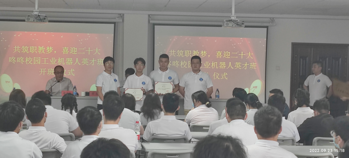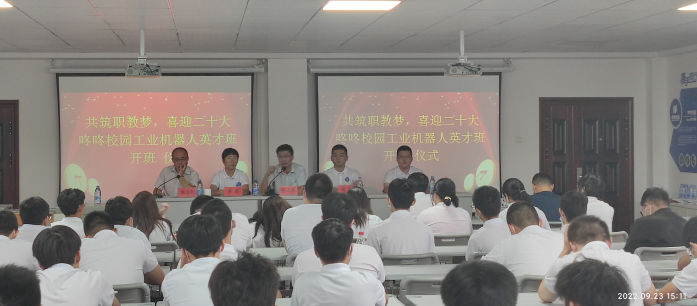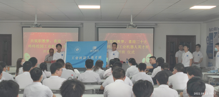 (郝玉龙)9月23日下午,Beat365官网机电工程系在南湖校区机电楼培训教室召开“工业机器人英才班”开班仪式。武汉咚咚英才教育科技有限公司相关领导、机电工程系班子成员及2022级工业机器人专业90余名新生参加活动。
