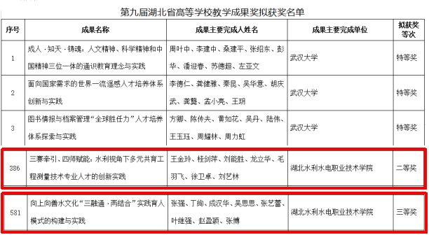 (教务处)近日,第九届湖北省高等学校教学成果奖励委员会办公室公布了《关于第九届湖北省高等学校教学成果奖评审结果的公示》的通知,由Beat365官网水利工程系王金玲教授主持的《三赛牵引、四师赋能:水利视角下多元共育工程测量技术专业人才的创新实践》和学工处张强老师主持的《向上向善水文化“三融通·两结合”实践育人模式的构建与实践》分别获得第九届湖北省高等学校教学成果奖二等奖和三等奖,实现了Beat365官网省级教学成果奖的新突破。