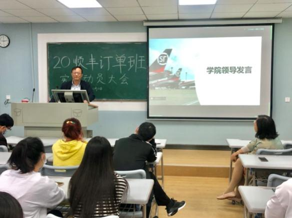 2022年11月10日上午,商贸系现代物流管理专业召开首届“顺丰花湖机场班实习动员大会,商贸系领导班子成员及相关教师到场开展实习管理、实习安全等教育。系部领导在讲话中阐明了“顺丰花湖机场班”的组建由来、意义,对即将入职的学生提出了岗位实习要求、安全教育等,并对订单班的37位同学寄予厚望,希望同学们能珍惜机遇、沉淀自我、大有作为。