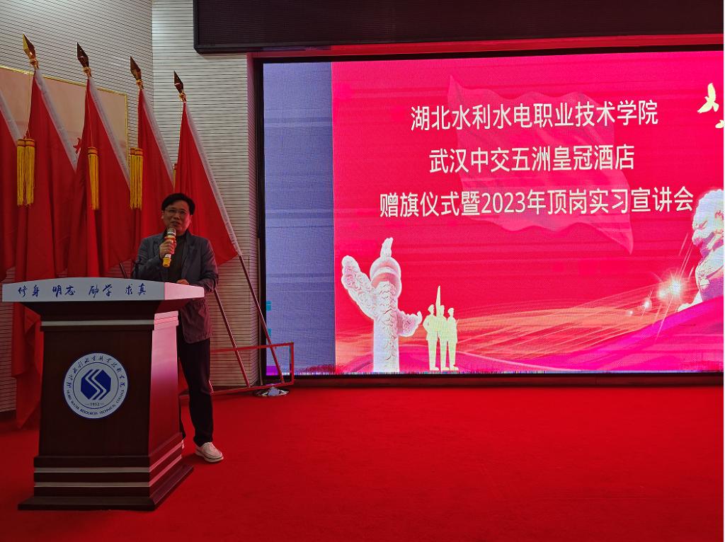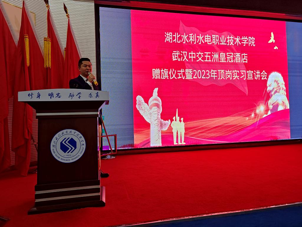 4月13日下午,武汉中交北辰五洲皇冠酒店副总经理冉先生、人力资源部赵经理一行向商贸管理系赠送了 “实训贯通培训英才,产教融合助企业发展”的锦旗。湖北水职院党委委员、副院长庹祖明代表学院接受了锦旗,商贸管理系负责人、酒店管理教研室全体教师参加了赠旗仪式。