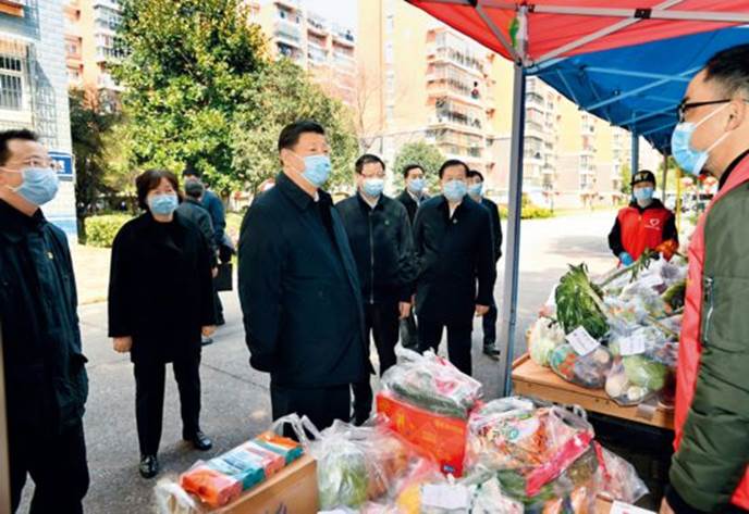 2020年3月10日,中共中央总书记、国家主席、中央军委主席习近平专门赴湖北省武汉市考察新冠肺炎疫情防控工作。这是习近平在东湖新城社区生活物资集中配送点,详细询问社区群众生活物资采购和供应情况。 新华社记者 谢环驰/摄