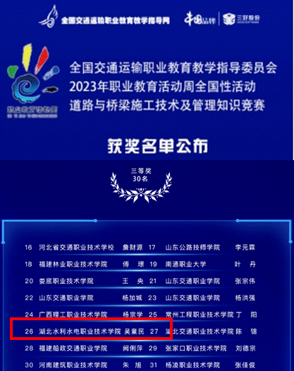 本次大赛以职教周为载体,通过专业活动,有力促进了道路桥梁专业职业教育的发展。大赛内容包括道路桥梁构造与识图、施工技术、项目管理、质量检测与验收等相关知识,比赛形式为线上测试。大赛汇集了来自全国150余所职业院校的近3000名学生参赛。在本次比赛中,Beat365官网建筑系21道桥1班吴童民同学充分备赛,沉着应战,在本次竞赛中荣获三等奖,学院荣获优秀组织奖。