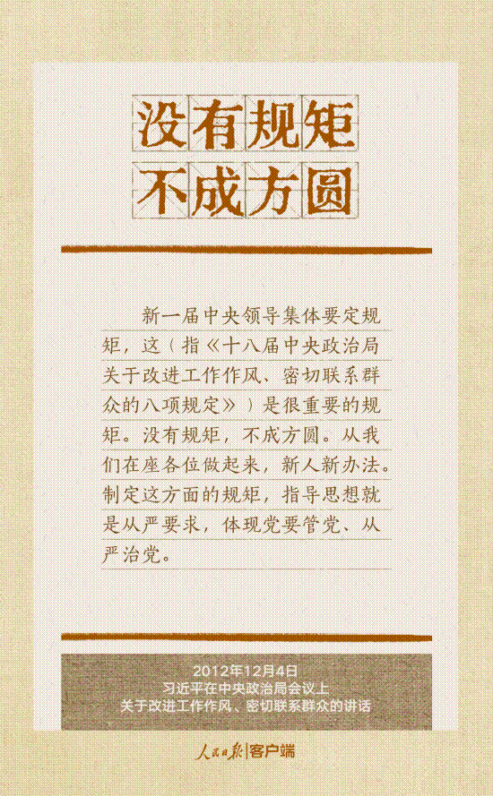 党的十八大以来,习近平总书记多次就抓好党的作风建设、贯彻落实中央八项规定精神发表重要讲话,作出重要批示,提出明确要求。“没有规矩,不成方圆”、“己不正,焉能正人”、“尽小者大,慎微者著”……总书记引用的这些古语耐人寻味。