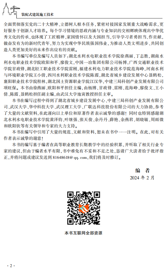 本教材立足装配式建筑行业前沿,创新采用活页式设计,支持知识动态更新,确保教学内容与技术发展同步。教材深度融合岗位需求与行业标准,依据国家最新规范及“1+X”职业技能等级标准构建模块化课程体系,内容覆盖装配式建筑全生命周期的核心环节,通过嵌入“1+X”实训模块,采用“任务驱动案例教学”方法,帮助学生在掌握理论知识同时提升实践能力,并兼顾考证需求。