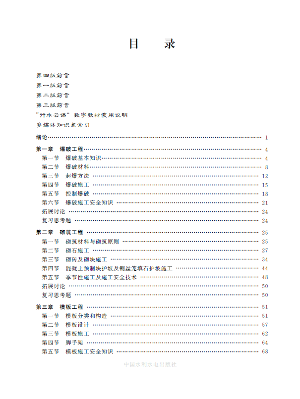 近年来,水利水电工程施工技术快速发展,根据党的二十大精神要求和高等职业教育水利类各专业人才培养目标,以国家现行建设工程标准、规范和规程为依据,以施工员、安全员、质检员和二级建造师等职业岗位能力的培养为导向,吸取水利水电工程施工的新技术、新工艺、新方法,突出实践性、针对性和实用性,编写团队于2023年对教材进行第四版修订,使这本教材更能反映国内外水利水电工程施工的先进经验和技术成就,匹配行业企业需求。