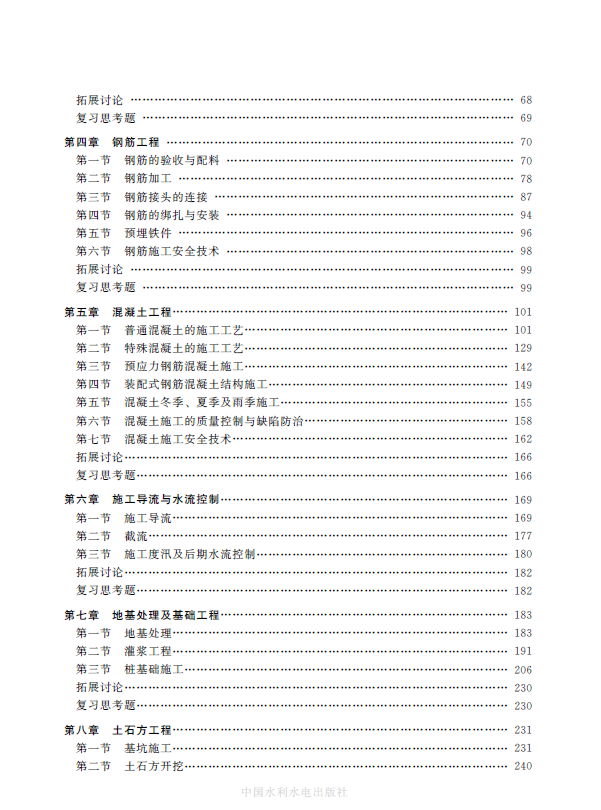 《水利水电工程施工技术》(第四版)共分成十章,主要内容包水利水电土建工程常见工种施工工艺及建筑物施工技术两大部分,具体内容为:第一章 爆破工程,第二章 砌筑工程,第三章 模板工程,第四章 钢筋工程,第五章 混凝土工程,第六章 施工导流与水流控制,第七章 地基处理及基础工程,第八章 土石方工程,第九章 混凝土建筑物施工,第十章 地下工程施工。