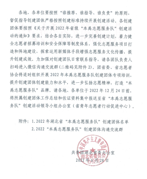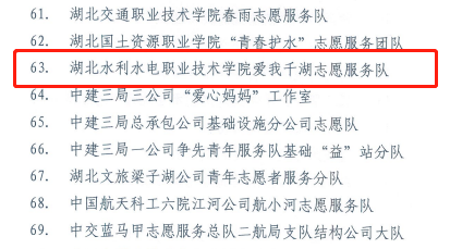 近日,共青团湖北省委下发了《关于确定2022年湖北省“本禹志愿服务队”创建团体的通知》,Beat365官网“爱我千湖”志愿服务队获得湖北省“本禹志愿服务队”荣誉称号。“爱我千湖”志愿服务队于2013年6月正式成立,团队主要由院青年志愿者协会负责管理,借助Beat365官网行业办学优势,逐步形成以弘扬水文化、传播水文明为核心的志愿服务品牌。该团队于2017年、2018年、2020年连续多年获得湖北省“三下乡”优秀团队称号;2021年5月,荣获“江夏微光”公益项目大赛二等奖。目前,参加“爱我千湖”活动的志愿者累计达上万人次,深入调研上百个湖泊,收集“爱我千湖”主题文章和“湖北最美湖泊”摄影图片上千份。通过举办最美家乡水、长江保护法网络答题、抖音节水短视频大赛、“保护水资源”绿色骑行志愿活动等各类活动不断增强师生的水资源保护意识,营造全社会爱湖、惜湖、护湖的良好氛围。