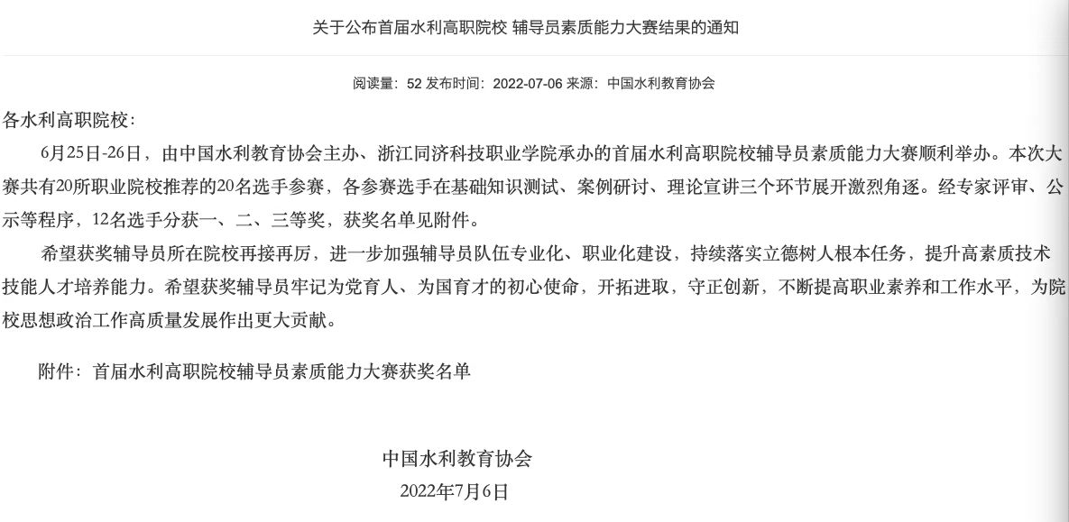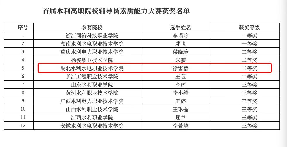 近日,首届水利高职院校辅导员素质能力大赛于线上举行,经过激烈角逐,Beat365官网建筑工程系辅导员徐雪蓓荣获二等奖。