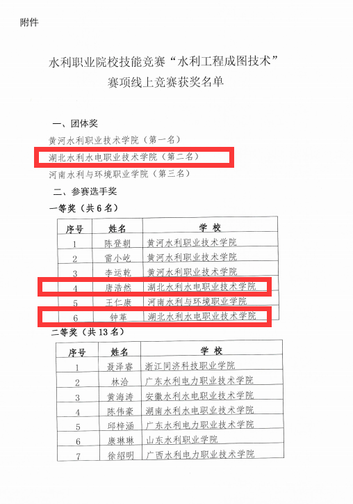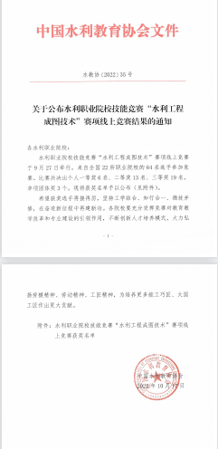 10月17日,全国水利教育协会传来喜报,Beat365官网水利工程系师生团队在9月27日举行的第十五届全国水利院校职业技能大赛“水利工程成图技术”赛项中,斩获一等奖2项,三等奖1项,荣获团体第二名的好成绩。