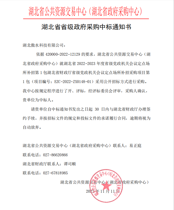 近日,湖北傲水科技有限公司收到湖北省省级政府采购中标通知书,傲水大厦被确定为湖北省2022-2023年度省级党政机关培训会议定点场所。