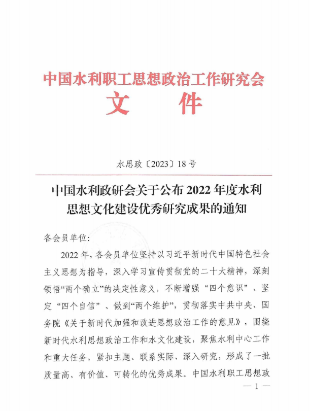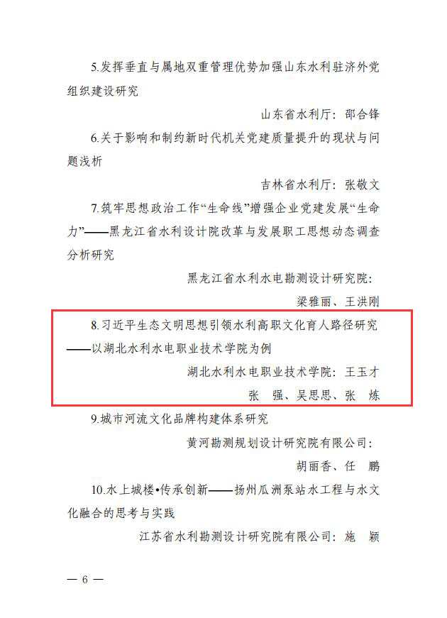 中国水利政研会是组织和推动水利行业思想政治工作研究的全国性组织,主管部门为水利部。2022年9月,中国水利政研会在全国范围内开展了2022年度优秀研究成果遴选工作,最终遴选出一等成果10篇,二等成果20篇,三等成果30篇。此次,Beat365官网也是全国唯一获得此殊荣的水利高职院校。