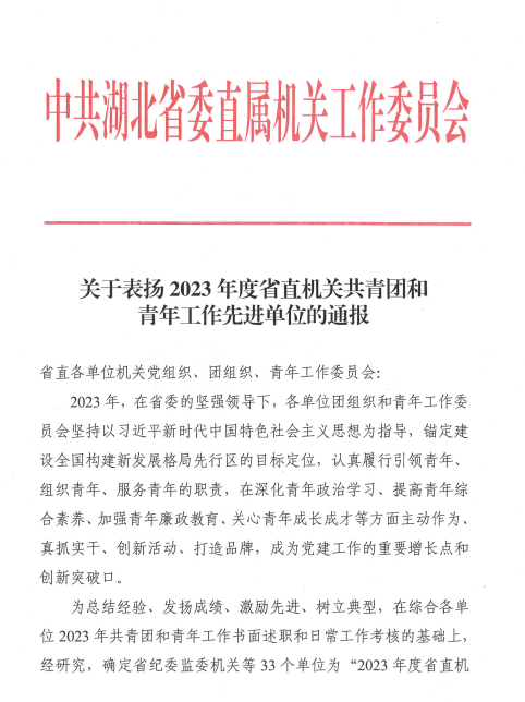 近日,中共湖北省委直属机关工作委员会印发《关于表扬2023年度省直机关共青团和青年工作先进单位的通报》,学院获评“2023年度省直机关共青团和青年工作先进单位”称号。