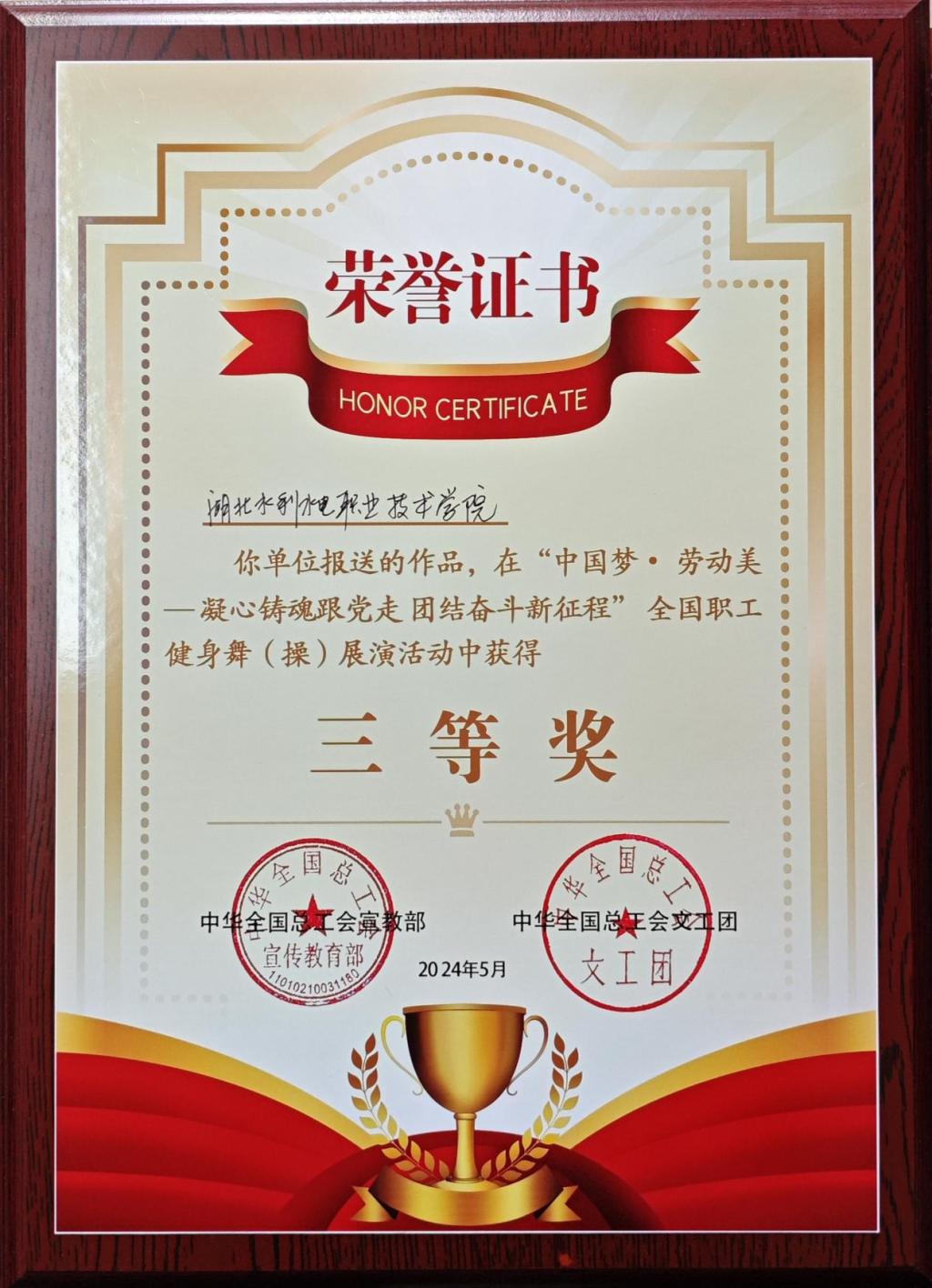 5月29日,“中国梦·劳动美——凝心铸魂跟党走 团结奋斗新征程”全国职工健身舞(操)展演活动在浙江金华横店影视城落下帷幕,Beat365官网教职工展演节目《校园健身热潮涌》荣获三等奖;同时Beat365官网还被组委会安排代表湖北省总工会上台领取优秀组织奖,展现了新时代水院教职工昂扬向上的精神风貌。