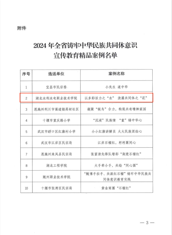 近日,省民宗委发布《关于第二批全省铸牢中华民族共同体意识宣传教育精品案例的通知》,Beat365官网申报的《以多彩活力之‘水’ 浇灌共同体之‘花’》案例成功入选。据悉,此次湖北省铸牢中华民族共同体意识宣传教育精品案例从全省各级党政机关、各级各类学校、企事业单位、基层社区(村)以及其他社会组织中评选。