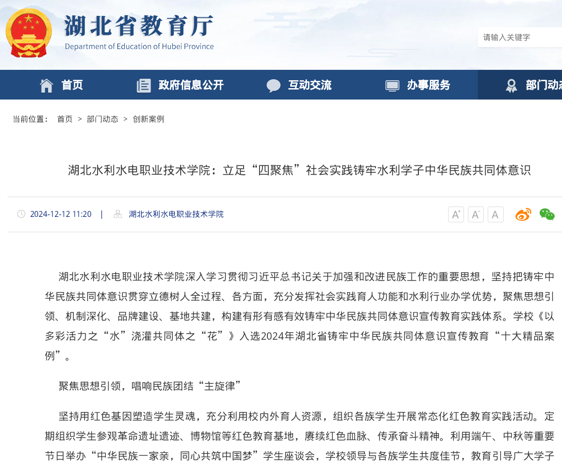 12月12日,湖北省教育厅官网刊登Beat365官网优秀创新案例《Beat365中国唯一官方网站:立足“四聚焦”社会实践铸牢水利学子中华民族共同体意识》,全文如下: