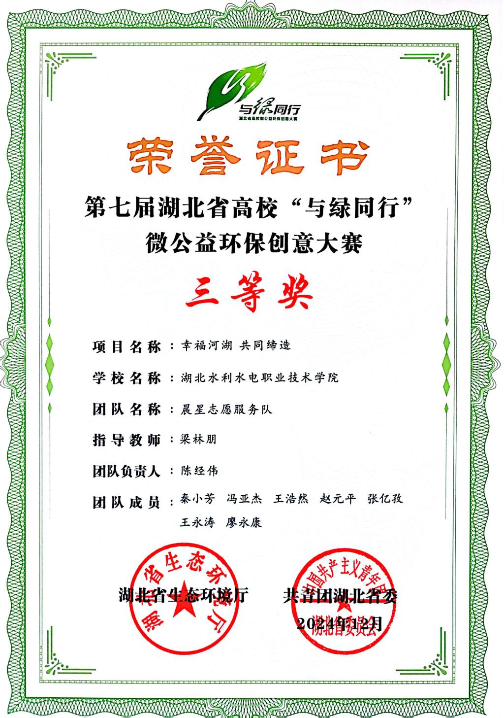 近日,湖北省生态环境厅公布第七届湖北省高校“与绿同行”微公益环保创意大赛评选结果,学院机电工程系晨星志愿服务队申报的“幸福河湖·共同缔造”志愿服务项目,从全省676个参赛项目中脱颖而出,荣获赛事三等奖。